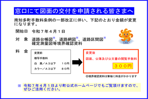 令和7年4月1日より、「南知多町手数料条例」の改正に伴い、建設課窓口で交付しております道路台帳図などの写しや諸証明の手数料が変更になりました。